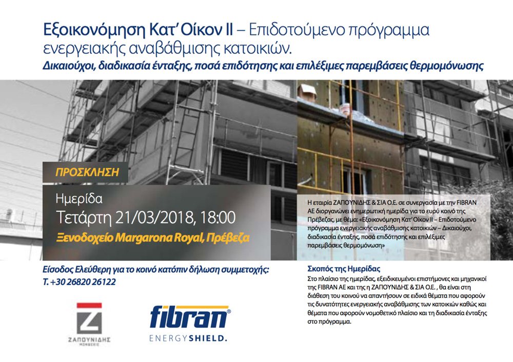 Για την άρτια ενημέρωση των καταναλωτών η ΖΑΠΟΥΝΙΔΗΣ & ΣΙΑ Ο.Ε. φέρνει στη Πρέβεζα την κορυφαία εταιρία παραγωγής θερμομονωτικών υλικών FIBRAN AE.