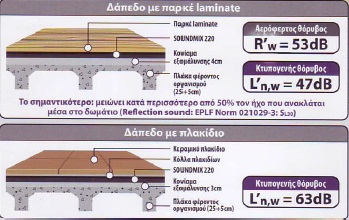 Χάρη στην ελαστικότητα και την αντικραδασμική συμπεριφορά του XLPE, το SOUNMIX 220 δημιουργεί ελαστική επαφή μεταξύ της πλάκας και του τελικού δαπέδου, και μειώνει τη μετάδοση των κτυπογενών ήχων σε άλλους χώρους του κτιρίου.